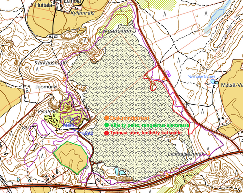 Pelto on erotettu reitistä muoviverkolla / merkkausnauhalla.